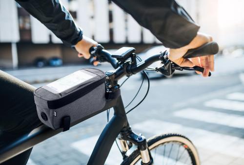 Padded, zipped bicycle frame bag in 600D RPET polyester with adjustable velcro straps and touch screen mobile holder compartment. With distinctive RPET label.