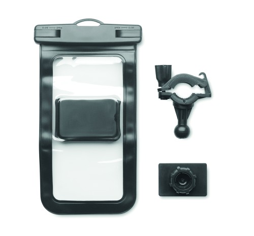 Waterproof bike mobile phone mount case in PVC, rotates through 360 degrees. Waterproof rating: IPX 6. Fits for 6,7 inch size.