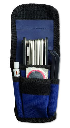 Bike repair kit. 15 piece multitool with 2 tyre levers, grater, glue and stickers including pouch with reflective trim.