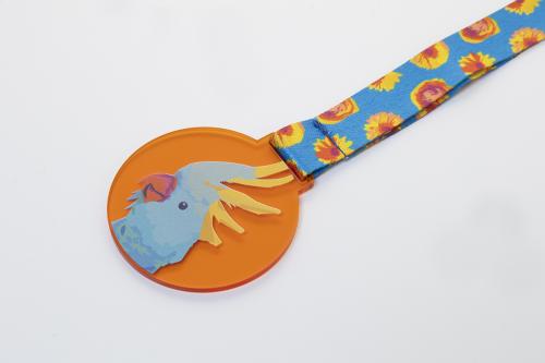 Custom made, acrylic medal with full colour graphics. On sublimation printed RPET lanyard. Price includes sublimation and UV LED printing. MOQ: 100 pcs.