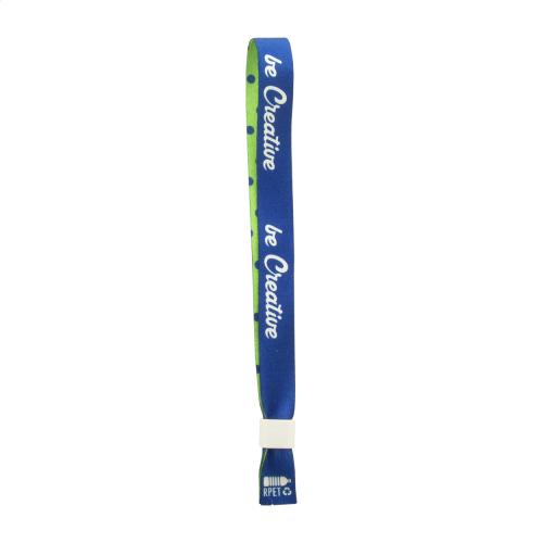 Custom made, RPET polyester festival bracelet with coloured plastic safety lock. With sublimation printed graphics on both sides. MOQ: 100 pcs.