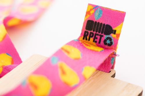 Custom made, square shaped bamboo medal on sublimation printed RPET lanyard. Price includes sublimation printing. MOQ: 100 pcs.
