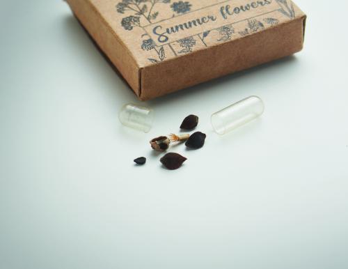 Pressed peat disc with mixed summer flower seeds presented in carton box. Made in EU.