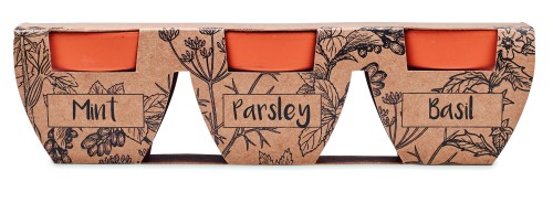 Set of 3 clay terracotta pots including 3 different seeds of 3 different herbs: mint, parsley and basil. Made in EU.