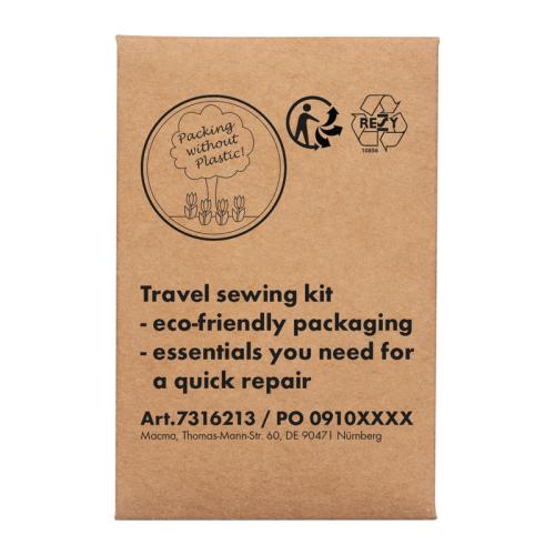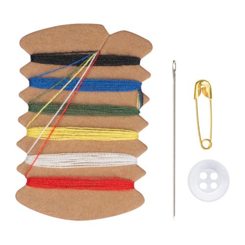Travel sewing kit in an cardboard packaging with all the necessary utensils for a quick repair.