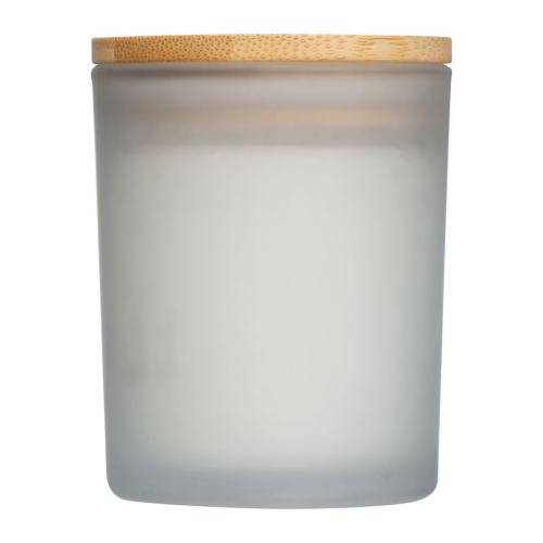 Candle in an elegant frosted glass with bamboo lid, decorative and versatile.