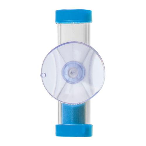 Hourglass made of synthetic material with suction cup and a running time of three minutes. Attachable e.g. to the bathroom mirrror to stay in time while toothbrushing.