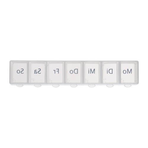 Plastic pill box with 7 compartments for the weekly storage of the required medication. The days of the week are also printed in Braille.