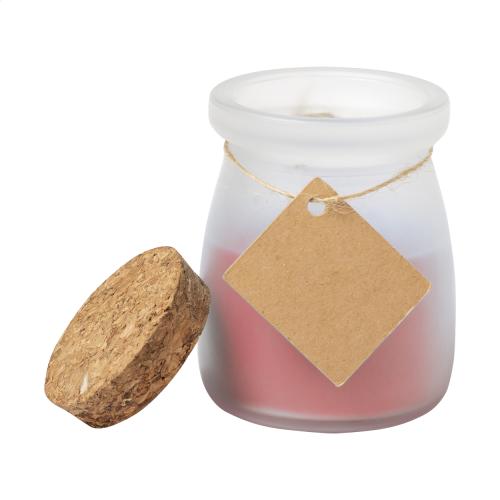 Scented candle in glass jar with cork lid.