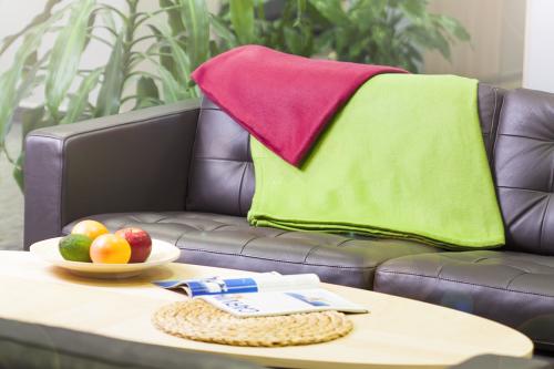 Polar fleece blanket with velcro carry strap. 100% polyester, 200 g/m².