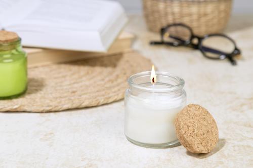Vanilla scented plant-based wax candle in glass holder with natural cork lid. With 80 grams of wax. Burn time: 16 hours. In kraft paper box.