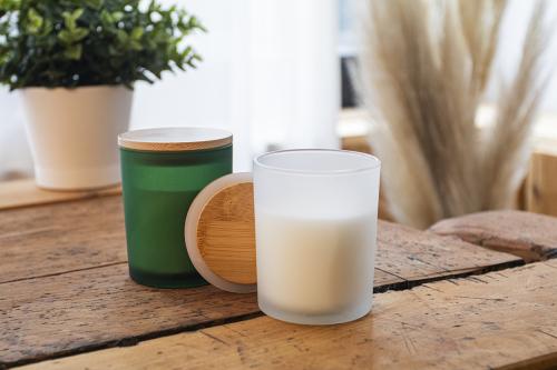 Scented plant-based wax candle in frosted glass holder with bamboo lid. With 200 grams of wax. In kraft paper box.