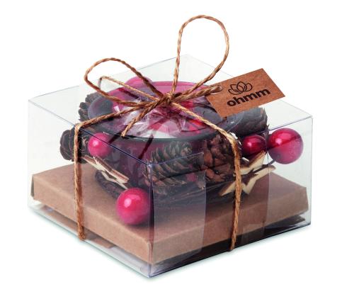 Glass candle holder surrounded via ornaments. Presented in a carton and PVC box with ribbon and label.