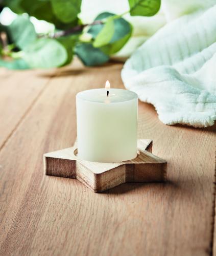 Star shaped wooden decorative base with vanilla fragranced candle.