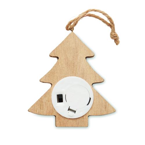 Wood (80% poplar wood and 20% weed wood) decorated tree with 6 LED light and hanging cord. Including 1 CR2032 battery. Wood is a natural product, there may be slight variations in colour and size per item, which can affect the final decoration outcome.