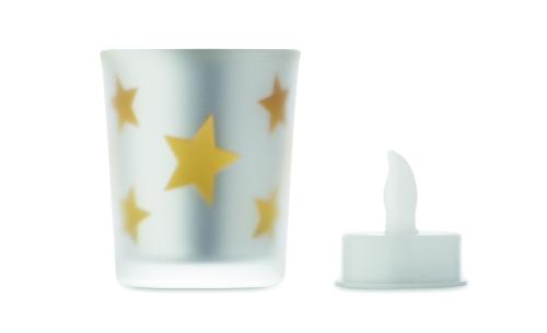 LED tea light in PP candle in glass jar. 1 button cell CR2032 battery included.