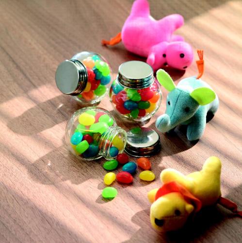 Multicolour jelly beans in a glass container jar with metallic cover. 40 grams candy.