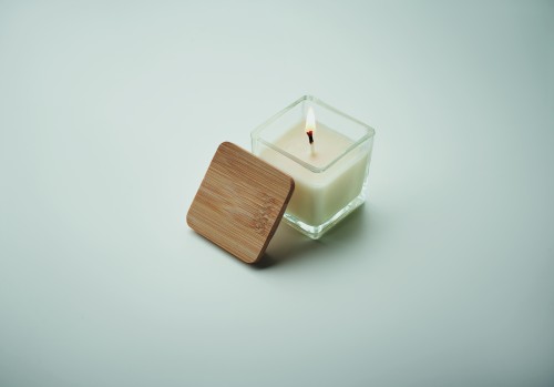 Fragranced plant based wax candle in squared glass holder with a bamboo lid. 50 gr. Burn time: 8 hours. White(06) vanilla, yellow(08) lemon, orange(10) orange, green(48) apple.