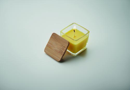 Fragranced plant based wax candle in squared glass holder with a bamboo lid. 50 gr. Burn time: 8 hours. White(06) vanilla, yellow(08) lemon, orange(10) orange, green(48) apple.