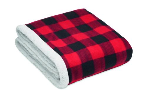 Sherpa lined fleece blanket in RPET polar fleece (180 gr/m²) and polyester sherpa (230 gr/m²). Presented in an RPET nylon carry handle.