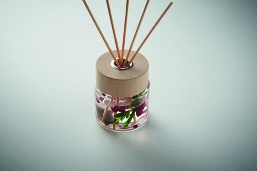 Glass jar with wooden fragrance diffuser with flower decoration inside, with 6 reed stick. Fragrance: vanilla. Capacity: 100ml.