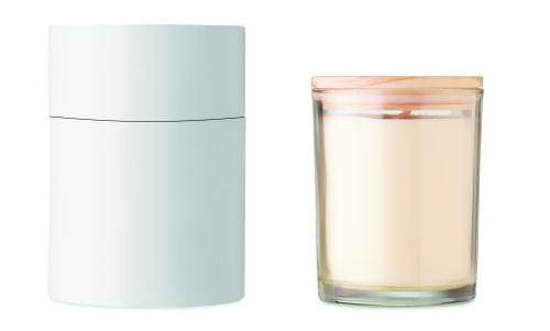 Vanilla fragranced plant-based wax candle in glass with a bamboo lid, presented in a 8 cm diameter paper tube gift box. Make the house smell nice with this vanilla scented candle. Close the candle off with the bamboo lid when you are not using it to make it a more natural looking decoration. Burn time: 40 hours. Bamboo is a natural product, there may be slight variations in colour and size per item, which can affect the final decoration outcome.240gr.