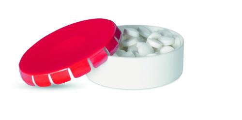 12 gr sugar-free mints in plastic container and tin cover and plastic bottom. Easy-press opening.