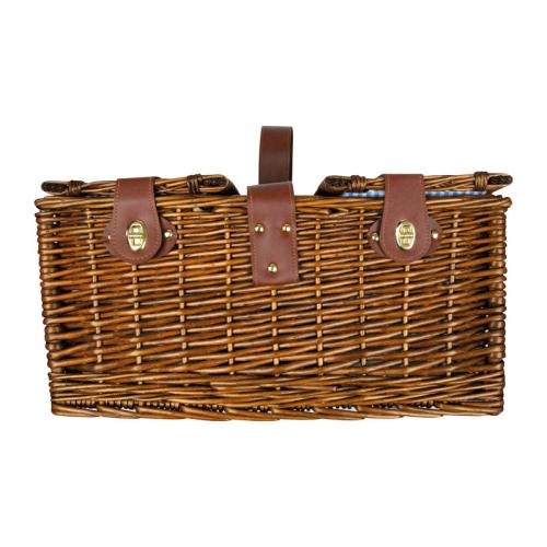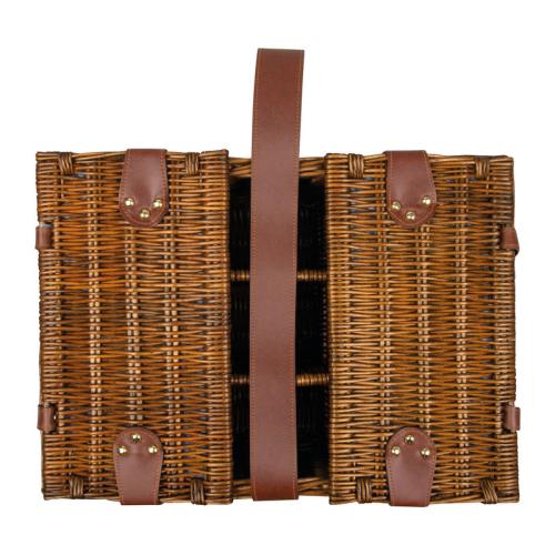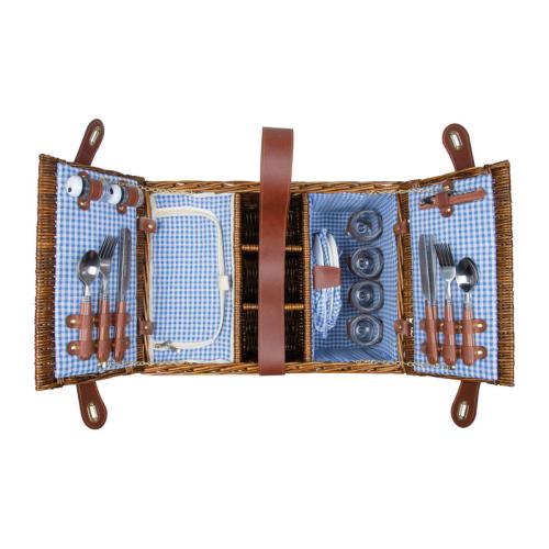 Wicker picnic basket for 4 people. The basket includes 4 glasses, 4 porcelain plates, 4 cloth napkins, 12-piece cutlery, salt and pepper shaker, 3 compartments for bottles, waiter's knife, and integrated cooling compartment. Branding is possible buying the separately available metal tag, item number 90868.
