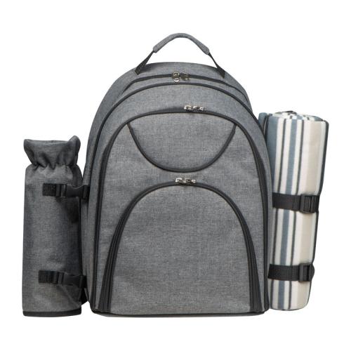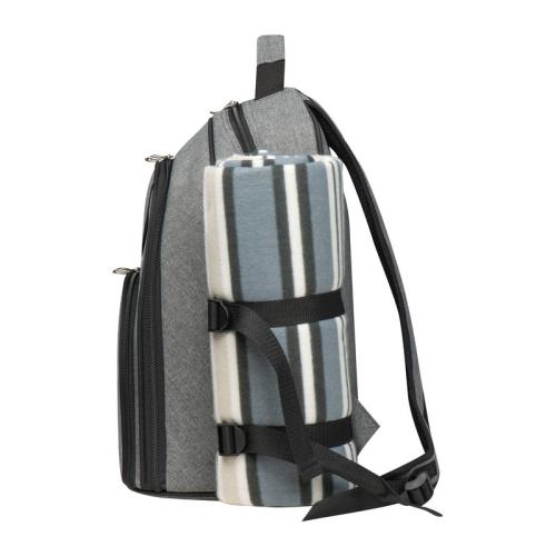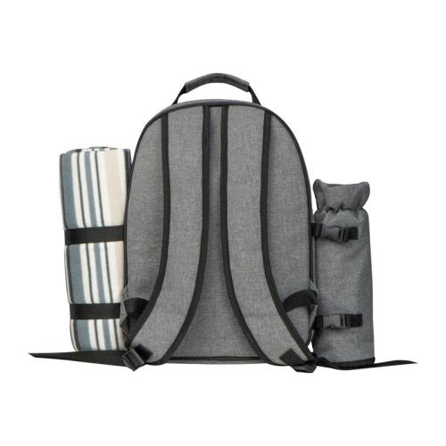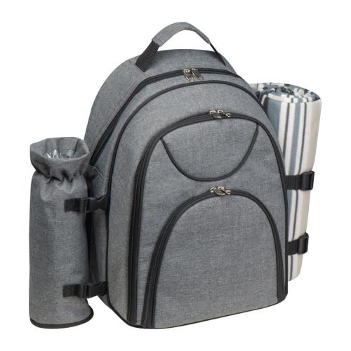 Picnic backpack consisting of four plates, glasses, cutlery, a salt shaker, a pepper shaker, a picnic blanket and a bottle holder.