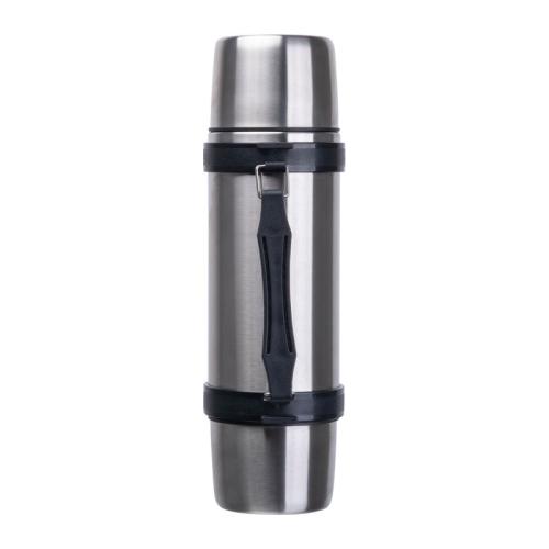 Robust 1000 ml vacuum insulated stainless steel flask with carrying strap and two integrated cups, ideal for on the go.