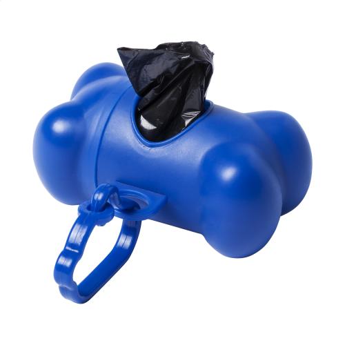 Plastic, bone shaped dog waste bag dispenser with carabiner and 15 bags.