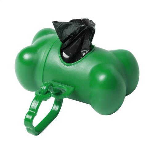 Plastic, bone shaped dog waste bag dispenser with carabiner and 15 bags.