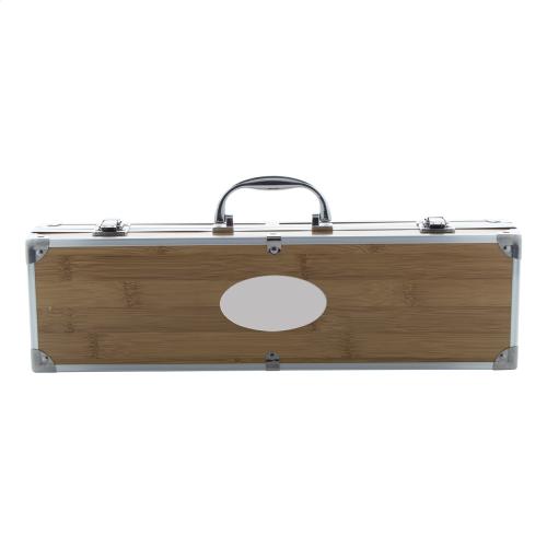 3 pc stainless steel, bamboo handle barbecue set (fork, clip and shovel with bottle opener). In bamboo patterned aluminium case.