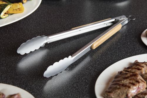 Stainless steel barbecue clip with bamboo handles and locking mechanism.
