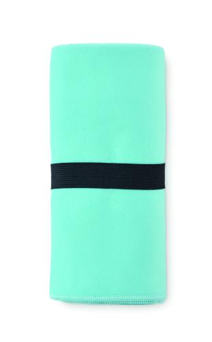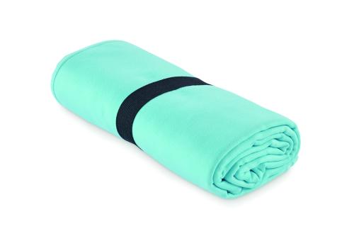 Double sided velvet microfibre sports/beach towel 200 gr/m² with snap button strap closure.