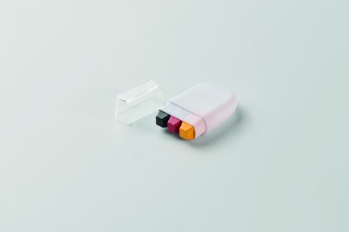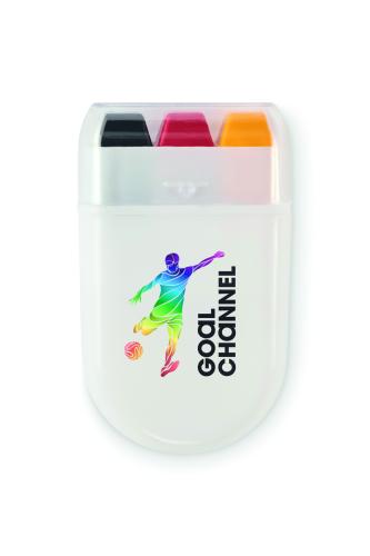 Body paint stick in national flag colours with wax paint in PP case and PS lid.
