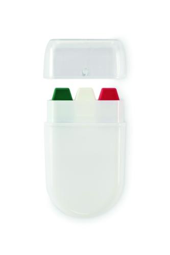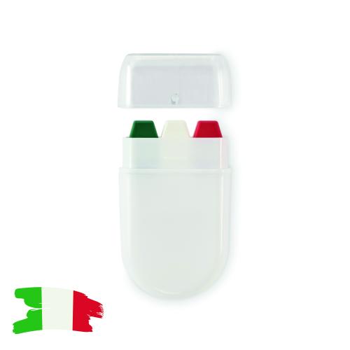Body paint stick in national flag colours with wax paint in PP case and PS lid.