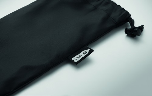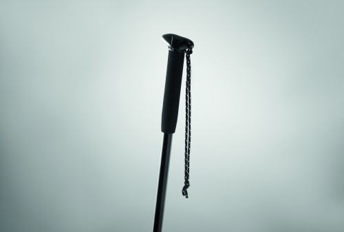 Telescopic walking pole with EVA handle, wrist strap, rubber tip, and mud basket. Adjustable from 105 to 120 cm. Packed in RPET drawstring pouch. Lightweight and durable design.