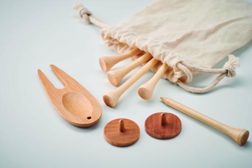 Golf accessories in bamboo including 6 golf tees, 1 piece golf divot and 2 golf wooden ball markers all presented in an organic cotton drawstring bag. Bamboo is a natural product, there may be slight variations in colour and size per item, which can affect the final decoration outcome.