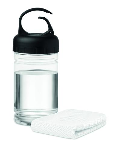 Cooling towel made of 100% polyester fiber in PET bottle. 300 ml capacity. Towel size = 30x80cm