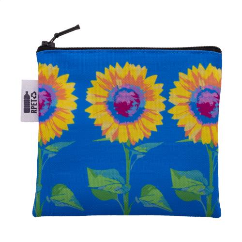 Custom made, zipped cosmetic bag in 600D RPET polyester. With all-over sublimation printed graphics. MOQ: 50 pcs.