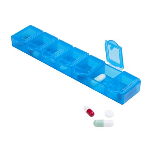 Plastic, weekly pillbox with 7 compartments.