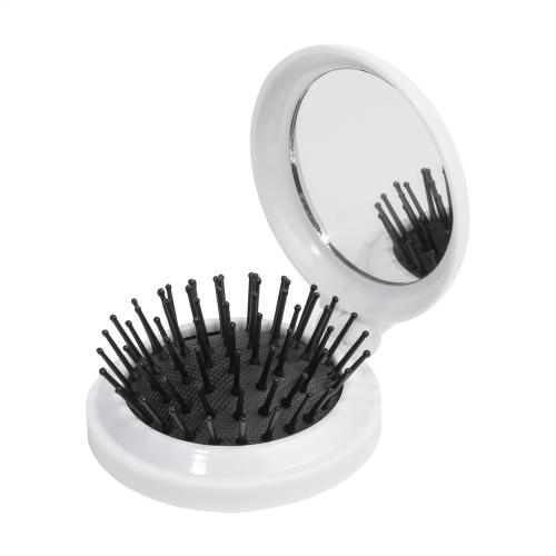 Foldable, recycled ABS hairbrush with pocket mirror.
