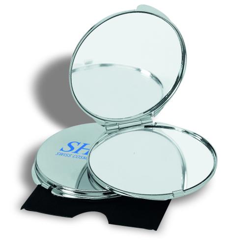 Chrome plated metal make up mirror with regular and magnifying mirrors in velvet case.