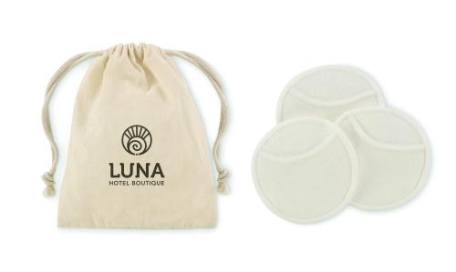 3 pieces of reusable and washable soft face cleaning pads (diameter 8cm) made of 70% bamboo fibre and 30% cotton in cotton pouch.