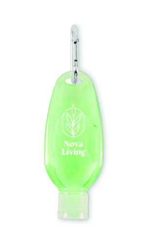 Aloe Vera gel in 50ml refillable PET bottle with PP flip cap and aluminium carabiner. Transparent green gel, ideal for travel use.