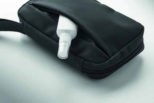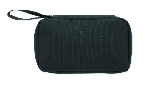 Toiletry bag in 600D RPET with PU coating, RPET mesh and 210D RPET lining. Features front zippered main compartment pocket, inner mesh and open pockets.
