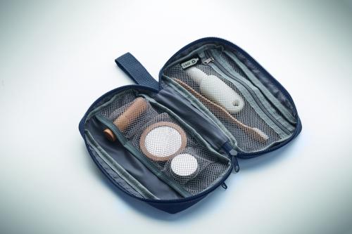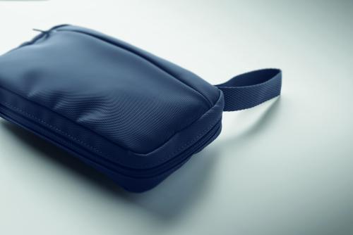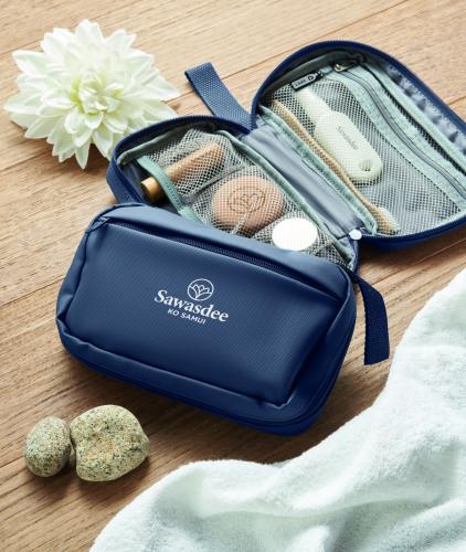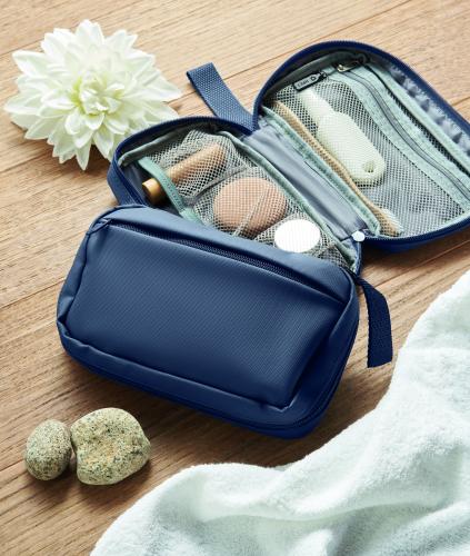 Toiletry bag in 600D RPET with PU coating, RPET mesh and 210D RPET lining. Features front zippered main compartment pocket, inner mesh and open pockets.