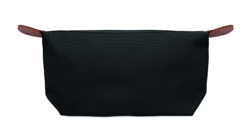 Cosmetic bag made of 600D RPET polyester with top zip closure and brown PU detail.