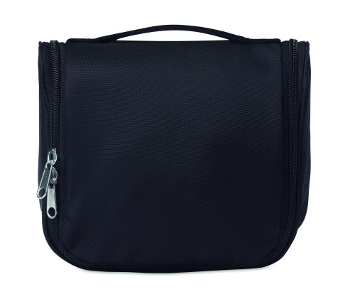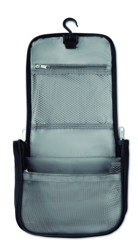 Hanging cosmetic bag with multi-compartments and mesh pockets in high density polyester. Ideal when travelling.